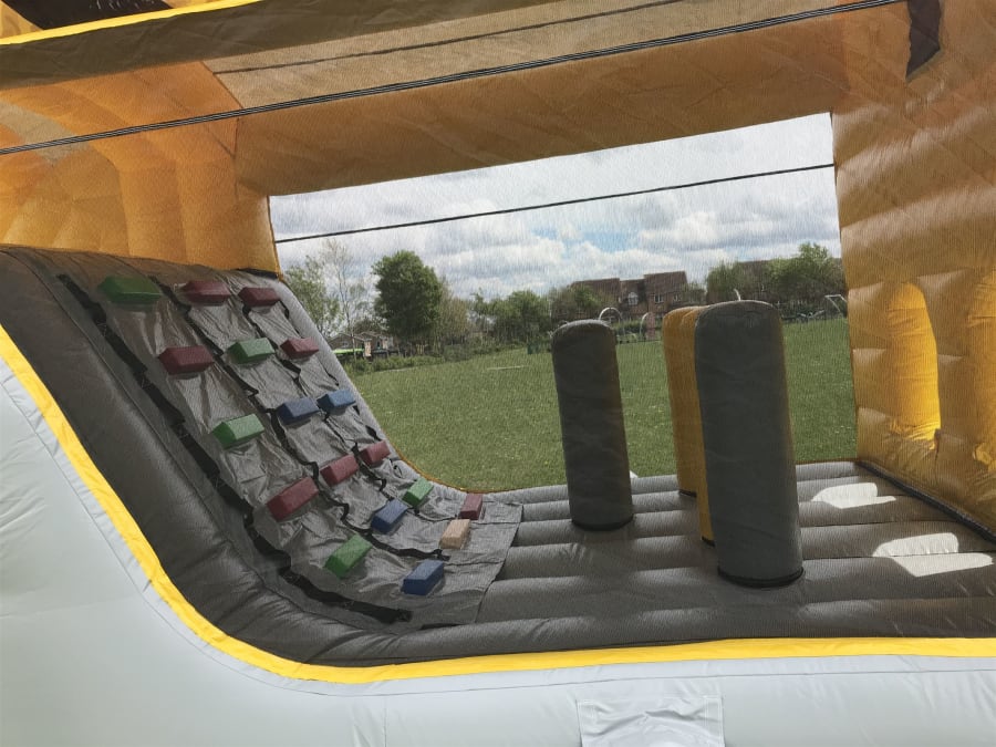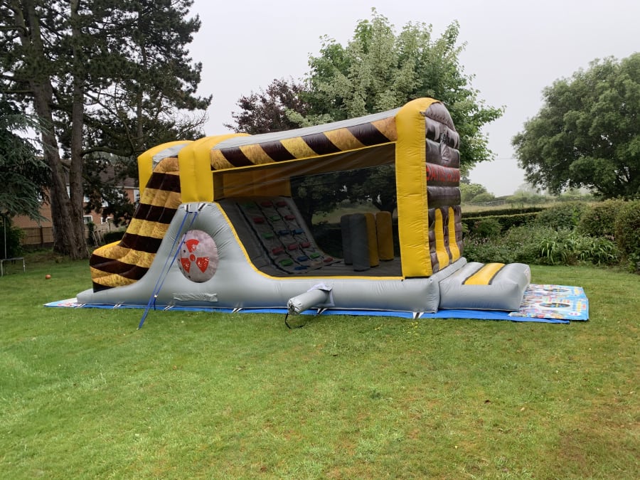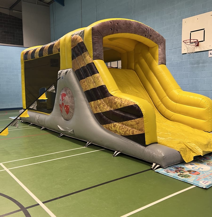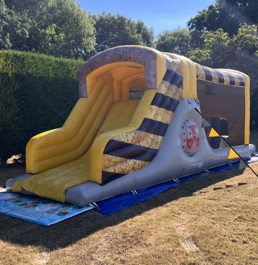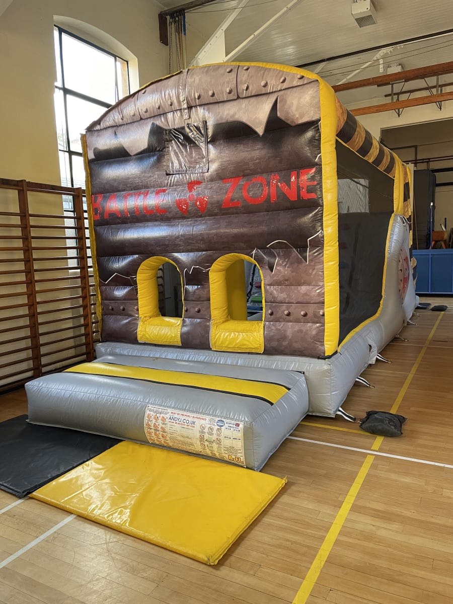Are you looking for the ultimate challenge? Then why not climb your way through our brand new 29ft long Battle Zone Fun Run...new for 2019! Find a opponent, count down from 3...2...1...GO! Start by crawling through the two entry points and make your way past the 5 bish bash posts that will slow you down and keep the competition close. Once you've made your way post the posts, climb up the steps and whiz down the 6ft platform slide. Whoever is first down the slide wins! Once you've finished, run back to the start and do it all again! Why not add an LED disco light and Bluetooth speaker for added fun and excitement. Listen to all of your favourite tunes whilst challenging friends and family with our BRAND NEW Battle Zone Fun Run available to hire now!
