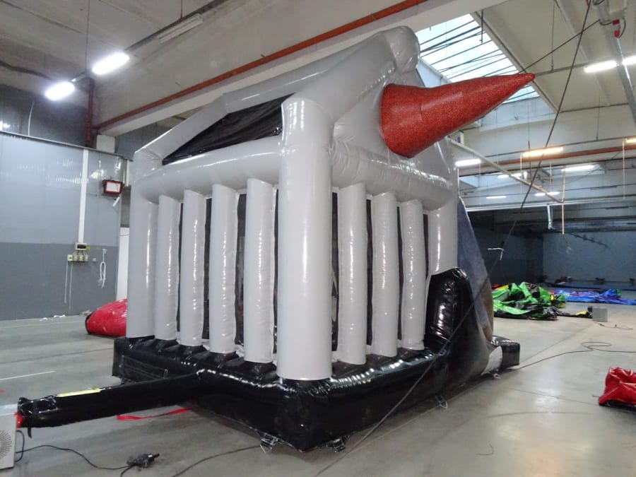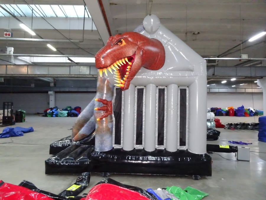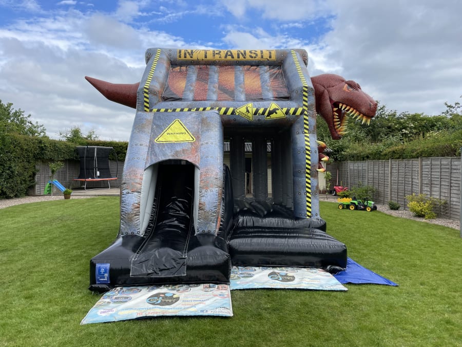 This unique 3D caged shaped bounce & slide is pretty roarsome and will thrill any dino fan. With so much to offer, including a large bouncy area, 5ft platform slide, a real dinosaur head and tail breaking out each side of the cage, what's not to like? Don't bounce and shake the cage too much, Rex might think you're a tasty snack!