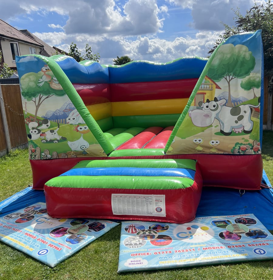 Introducing our brand new Farmyard Fun Bouncy Castle! This enchanting open-roofed bouncy castle stands tall at 7 feet, providing a colorful and immersive experience for children of all ages. With its vibrant hues of blue, green, red, and yellow, this multicoloured masterpiece brings the joyful essence of a farmyard right to your event. Step inside and imagine a world where farm animals come to life. The castle's walls are adorned with delightful illustrations of cheerful chickens and friendly cows, creating an atmosphere of the farm.