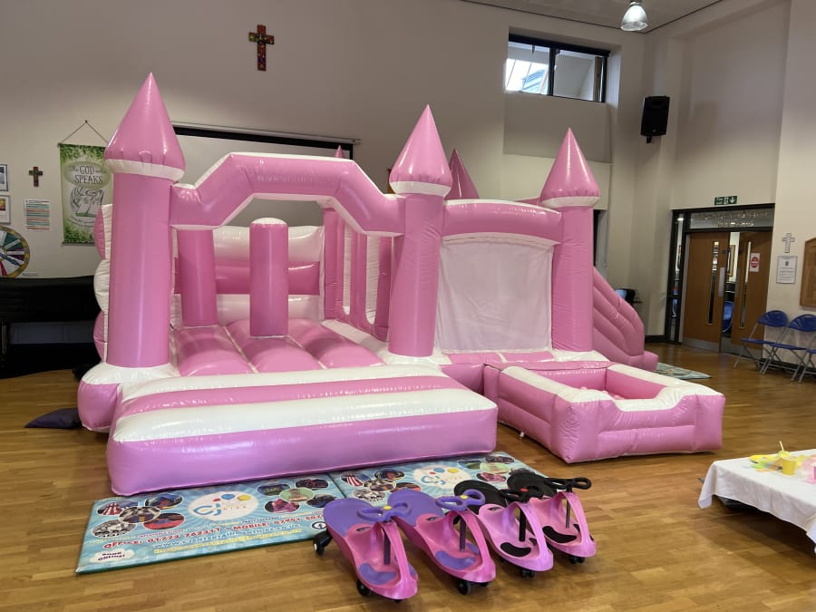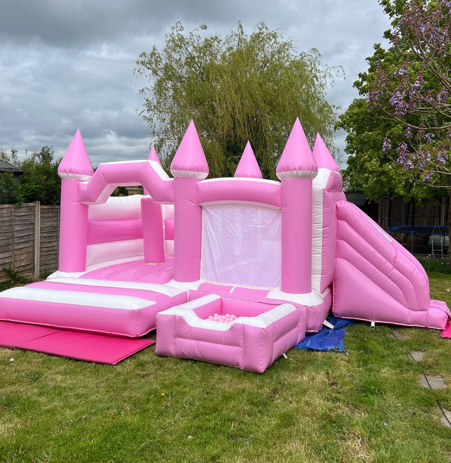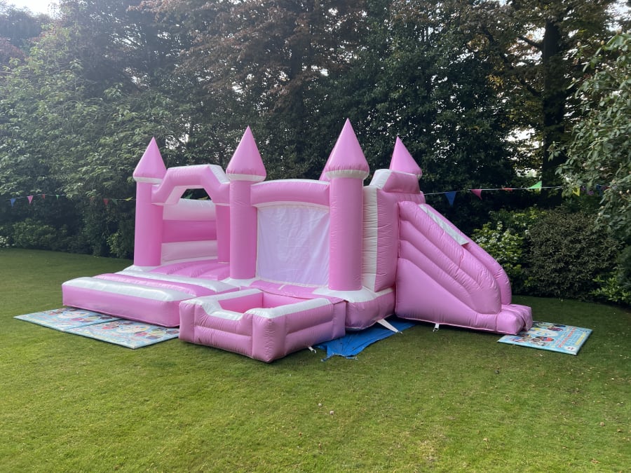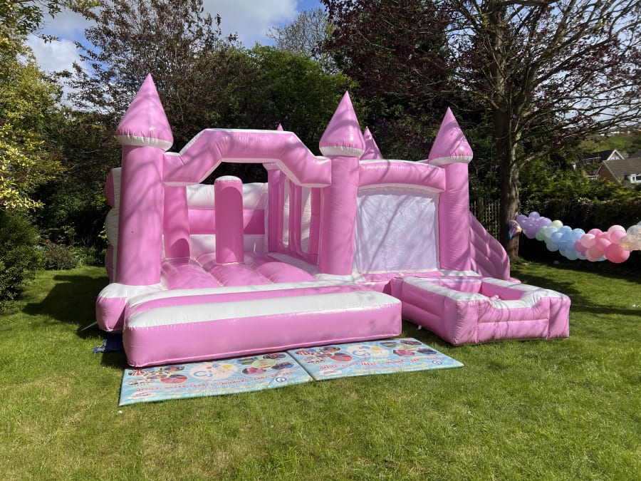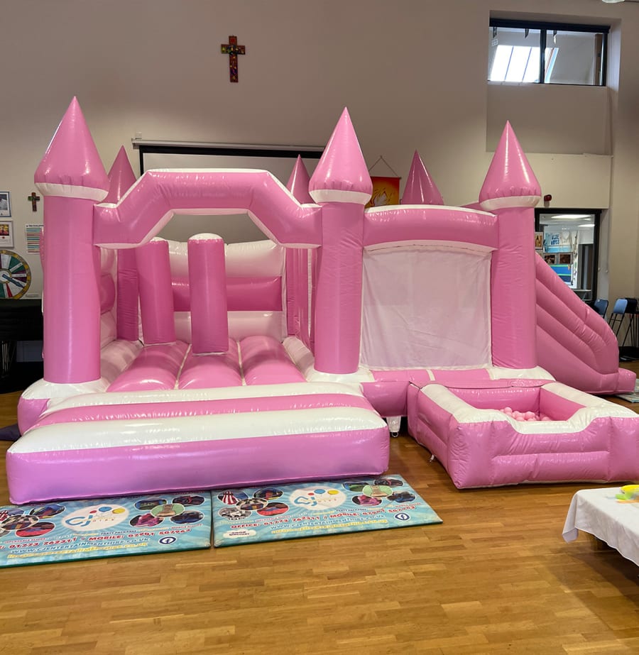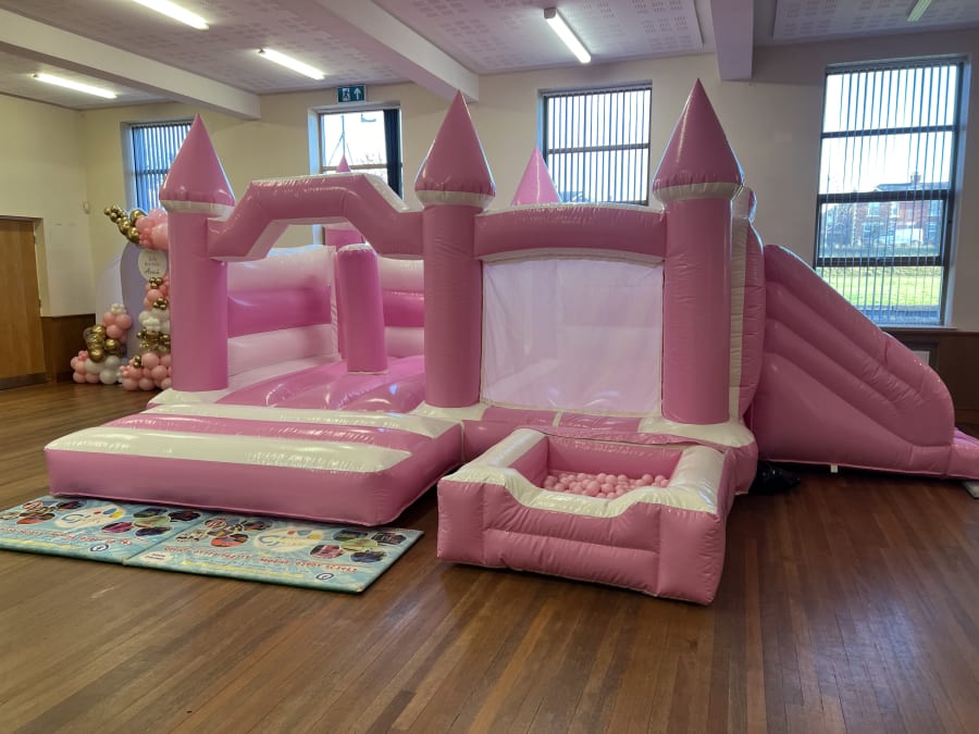 With it's biff bash posts and two crawl-through points that lead to another bouncing area, the Candy Land Play Arena offers endless opportunities for kids to jump, bounce, and play. The pink turrets give it a real castle vibe, making children feel like royalty as they explore and imagine themselves in a magical candy-filled world. But the fun doesn't stop there! Attached to the bouncy castle is a side slide that adds an extra element of excitement. If you really want to take the Candy Land Play Arena to the next level, you can opt for the additional ball pit feature. For a small charge, kids can dive into a sea of colourful pink balls, adding even more excitement and entertainment to their bouncy castle experience.