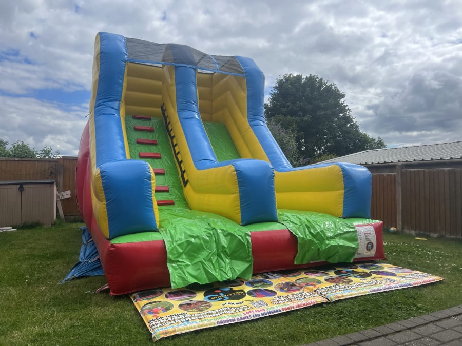 Add a splash of colour at your next party or event with our vibrant Multicoloured Inflatable Slide! Perfect for all ages, this 8ft platform slide features a rainbow of bright red, green, blue, and yellow colors to stand out and capture everyone's attention. The sturdy 8ft platform ensures a thrilling slide down every time, while the completely covered netted roof provides added safety and peace of mind for both kids and adults alike.