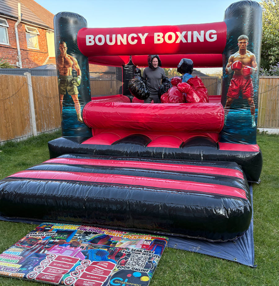Our all new Bouncy Boxing Ring provides hours of fun and laughter! With it's fully enclosed ring, featuring netted side walls and padded headware with giant boxing gloves included...the only thing you need to worry about is receiving a KO from your opponent!