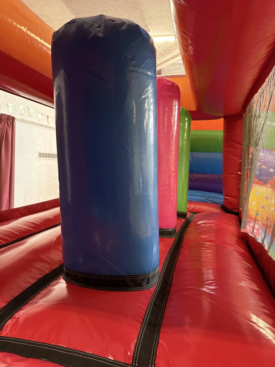 To start with, there is a large open bounce bed for multiple jumpers at once. The wow factor of this inflatable has to be the climb and slide section. Jumpers can climb the steps to the left hand side of the inflatable, making their way to the top and over the netted bridge. Don't forget about the 3 inflatable biff bash posts which adds to the fun!