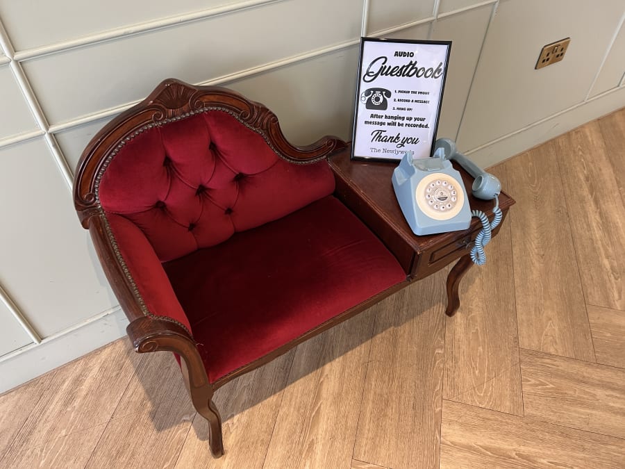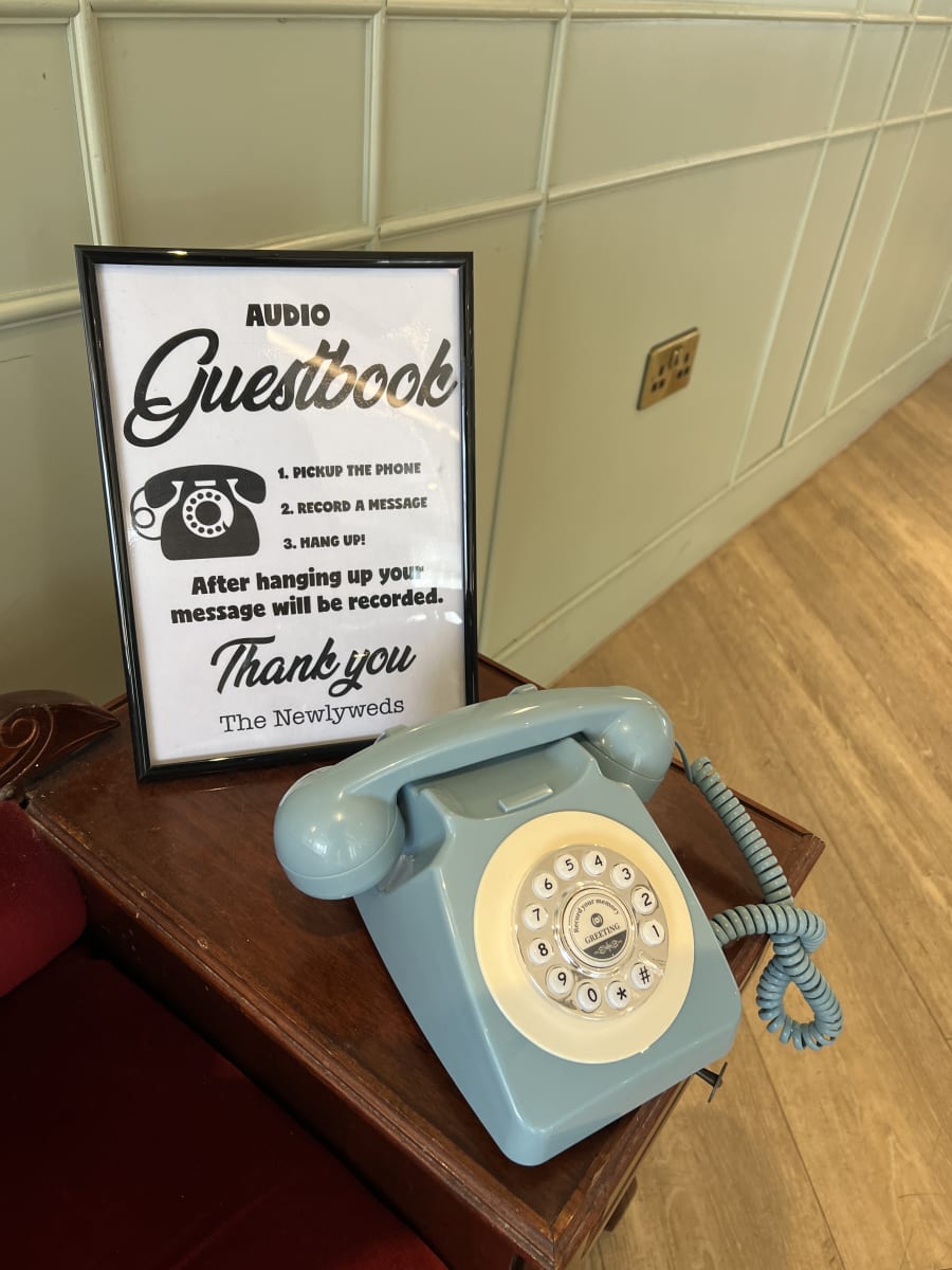 Our brand new Audio Guestbook is a unique and innovative way to capture memories and messages from your guests at any event! It features a vintage telephone table/seat that adds a touch of nostalgia and charm to the occasion. Guests can sit comfortably and record their personalized messages, anecdotes, and well-wishes for the host or guest of honor. The audio guestbook is available to hire and provides a fun and interactive way to document special moments and create lasting memories.