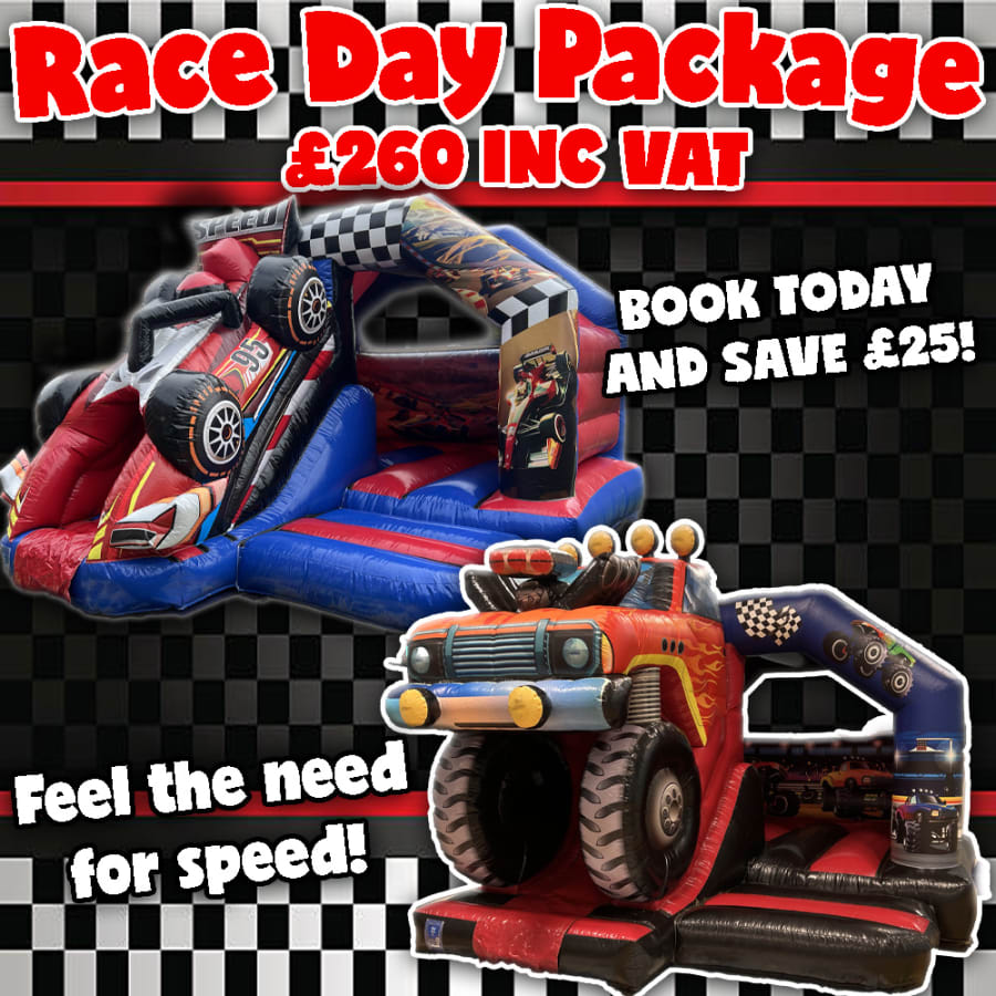 Start your engines and rev up the excitement with our exclusive Race Day Package available now! Designed to bring joy and thrill to every occasion and featuring two of our most exhilarating inflatables. This package promises endless fun for car enthusiasts and future racing drivers alike. Whether you're planning a birthday party, community event, or school fair, our Race Day Package is the perfect choice!