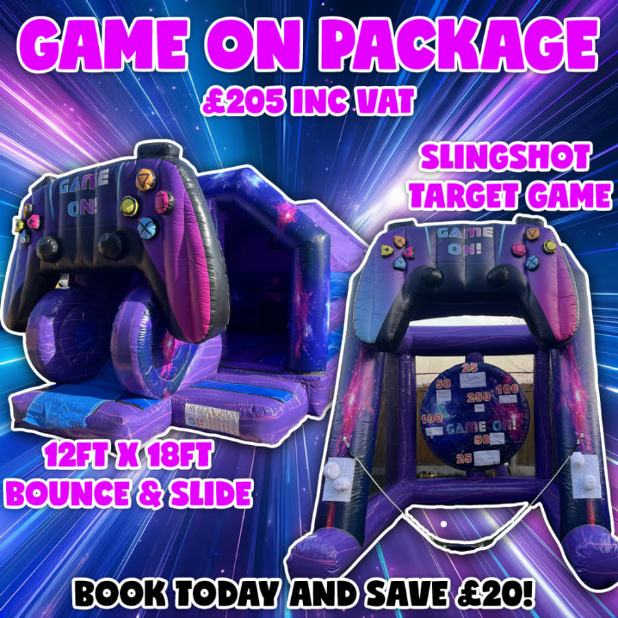 Bring your a-game to the party with our all new awesome looking Game On Package! Featuring two matching inflatables, any gamer will want this package at their next birthday party.