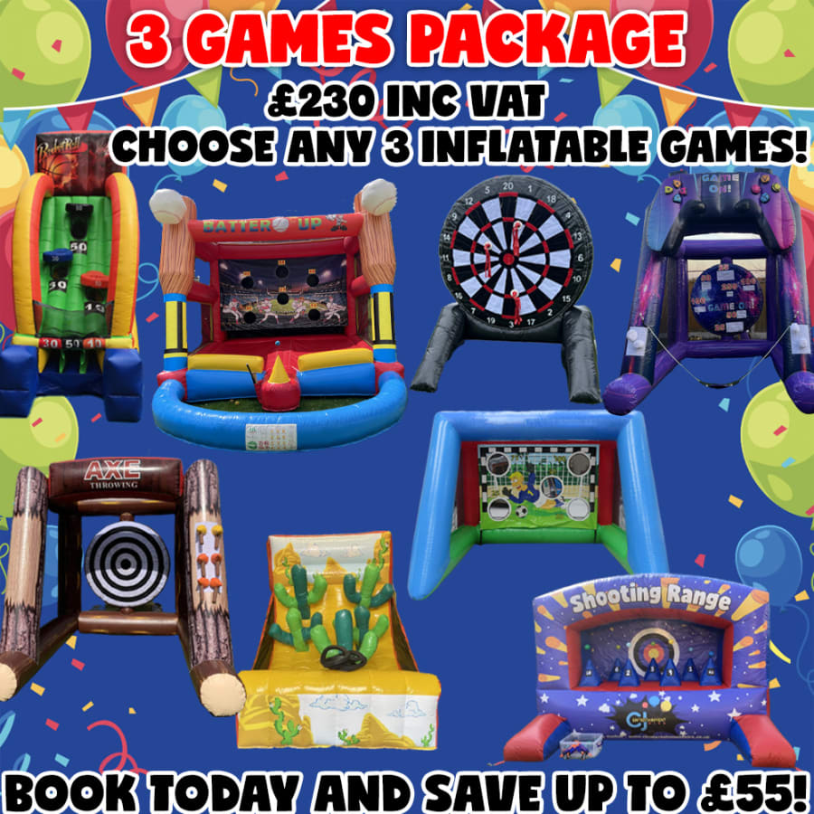 What's better than 1 game? What's even better than 2 games? You've guessed it...3 inflatable game for 1 awesome price! Choose from a huge selection of 8 unique inflatable games available to hire. A great way to keep party guests entertained, the only difficult choice you have to make is which games will you choose?