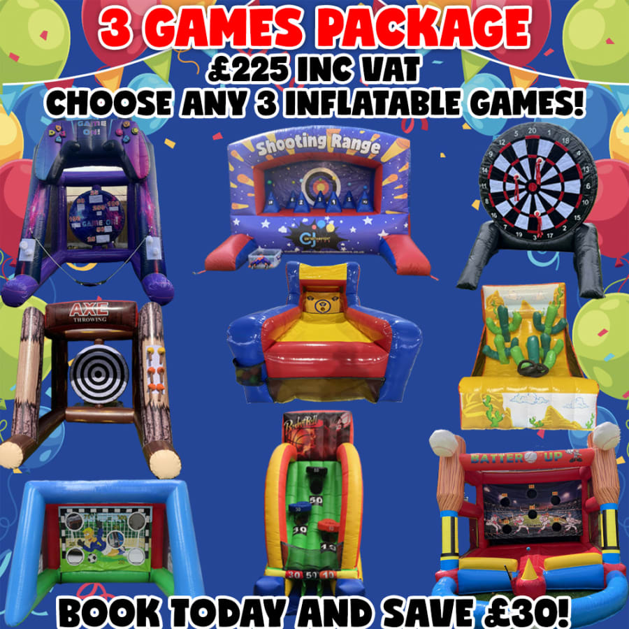 What's better than 1 game? What's even better than 2 games? You've guessed it...3 inflatable game for 1 awesome price! Choose from a huge selection of 9 unique inflatable games available to hire. A great way to keep party guests entertained, the only difficult choice you have to make is which games will you choose?