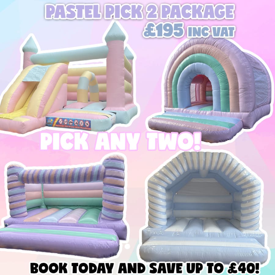Whether you're looking for a pastel bouncy castle with a slide, or an inflatable with a rain cover, or even a low height inflatable due to low ceilings in your venue, we have you covered with our Pastel Pick Two Package!