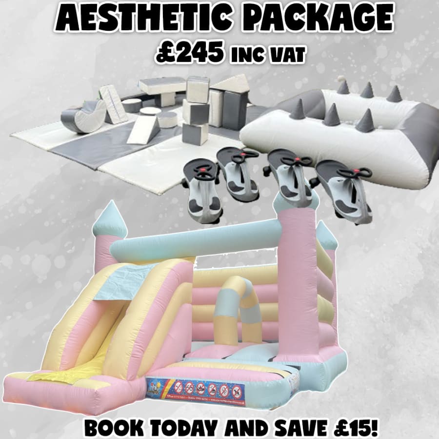 Our Aesthetic Package pairs a pastel-coloured bounce & slide with elegant white and grey soft play, creating a calm, stylish play zone that complements any venue — no themed balloons required.