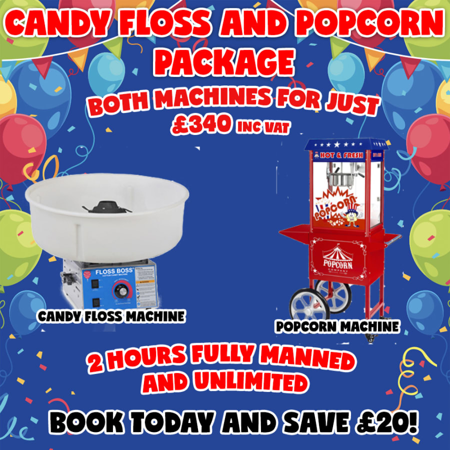 Our Candy Floss and Popcorn Package is just perfect for absolutely any occasion. Whether you’re booking for a Birthday Party, Wedding, Christening, School Leavers Party or any other celebration, wow your party guests and send their taste buds crazy with our range of candy floss and popcorn flavours. Check our availability, save £20 and book online today!
