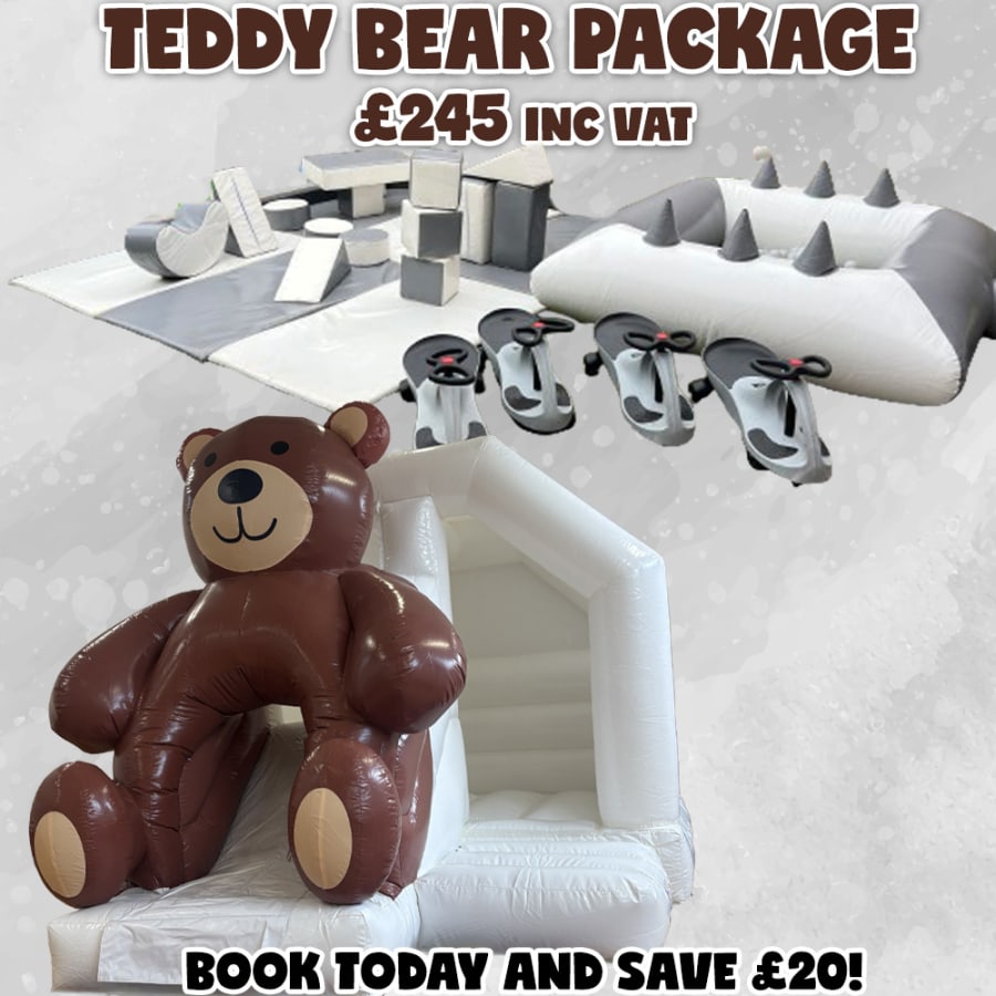 Ready to book the cuddliest package inflatable in town? Our Teddy Bear Package brings the bounce, slides, and smiles — we provide the teddy, you provide the cupcakes (optional but strongly advised).