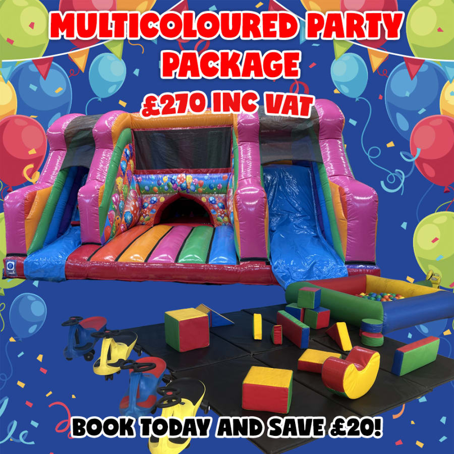 Make your child’s birthday or special event pop with our Multicoloured Party Package. This vibrant combo pairs a feature-packed multicoloured bouncy castle with matching soft play to create a safe, colourful play area that keeps children entertained for hours. Perfect for birthdays, family gatherings, and community events where energy, fun and variety matter.