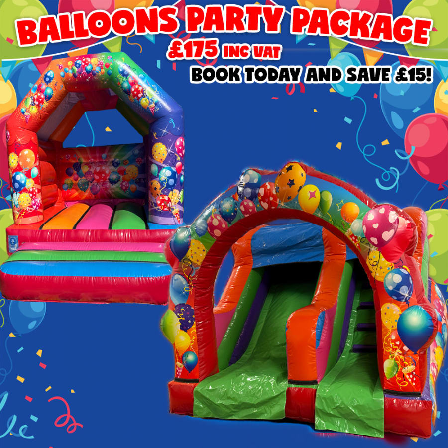 The package includes our 8ft x 10ft Balloons Party Bouncy Castle alongside a matching Balloons Party Inflatable Slide, both beautifully decorated with bold balloon artwork and lively colours. Designed to keep little ones entertained for hours, this combo offers the perfect mix of bouncing, climbing and sliding in a safe and engaging setup.