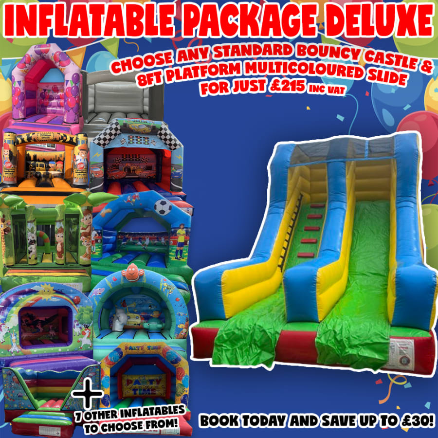 Choose from any of our 17 standard bouncy castles and match it nicely to our 8ft platform Multicoloured Inflatable Slide to host the ultimate party. Don't settle for 1 boring bouncy castle when you can enjoy 2 at a discounted package price.