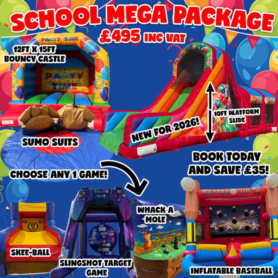 Make your event one to remember with our School Mega Package, everything you need for non stop fun all in one! This package is packed with variety, including our 40ft Balloons Party Assault Course, 12ft x 15ft Bouncy Castle, Sumo Suits and your choice of game whether that’s Skee Ball, Slingshot Target or Whack a Mole or Inflatable Baseball.