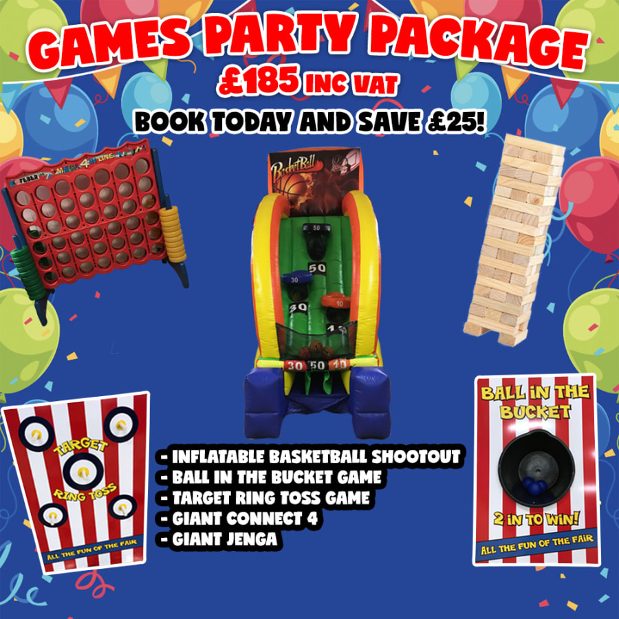 This Party Package is great for those with a competitive edge. With 5 individual games to play, this is guaranteed to keep you and your party guests busy for hours! Each game comes with all the accessories such as basketballs, rings for our Target Ring Toss game, 42 connect 4 pieces (21 yellow and 21 green), 3 soft balls for our Balls in the Bucket game and 58 solid pine jenga blocks.