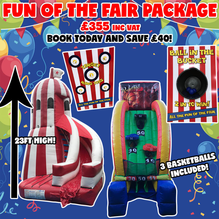 Is the Fun Fair in town…No? Well let it come to your door by booking our Fun Of the Fair Package! Included is our BRAND NEW Helter Skelter Inflatable Slide, Basketball Shootout, Target Ring Toss Game and Ball in the Bucket Game. Book today and save a whopping £40. Imagine what you could spend that spare £40 on!