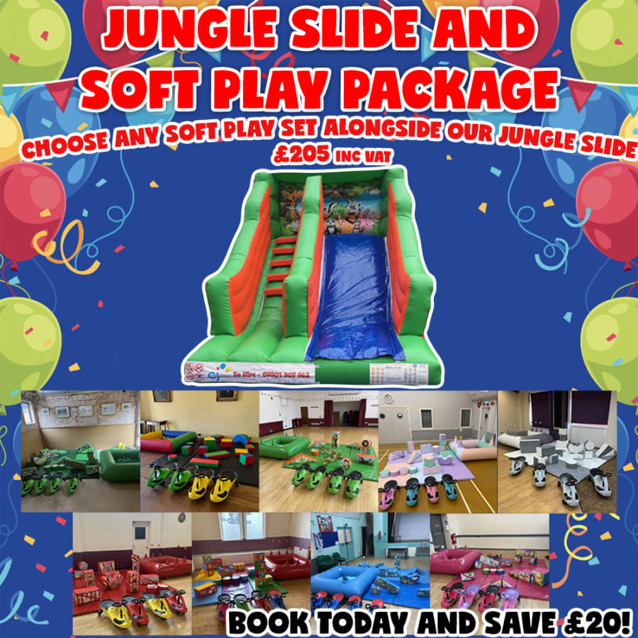 This package includes our 11ft high Inflatable Jungle Slide and any Soft Play set to suit your occasion! Or why not take a look at a few other Soft Play Party Packages we have available. Either our Bounce & Slide and Soft Play Package or our Bouncy Castle & Soft Play Package are just as popular for Nottingham bouncy castle hire!