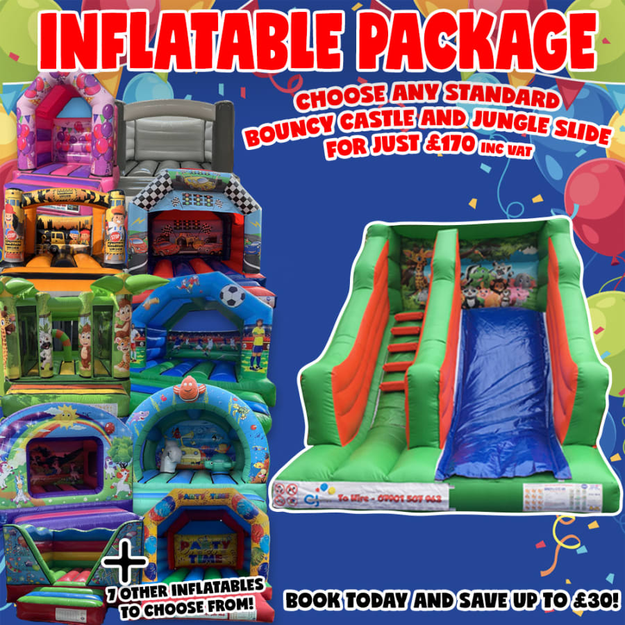 Our Inflatable Package is great option if you have plenty of room to fill! Whether you’ve booked a large village hall or have a spacious grassy area...check the sizes of each inflatable on our website if you’re unsure! This package is suitable if you have a large number of party guests attending and need to keep them bouncing all day long! Save up to £30 by booking our Inflatable Package today!