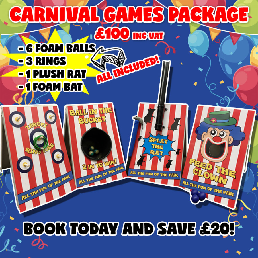 The carnival has come to town now let the fun begin! Included in this package are our 4 increasingly popular a-frame games each available from £30. However with our package price of £100, you automatically save £20 by booking the 4 together as 1! Perfect for back garden birthdays where kids can challenge one another. Or on your wedding day to 'break the ice' with family! Even better at the next school fete and summer fair.