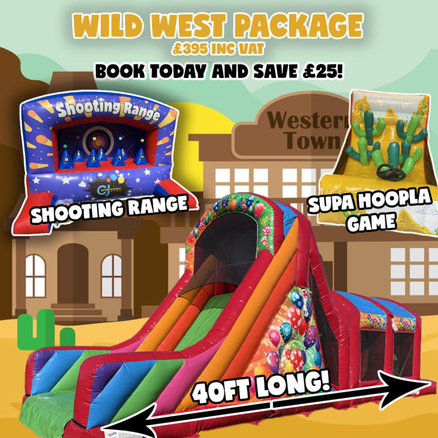 Howdy partner! Our all new Wild West Package is here and it’s here to stay! Pop on your cowboy hat and take a trip back in t’ the ol’den days. This package consists of our Shooting Range, Supa Hoopla Game and our all new 40ft Balloons Party Assault Course...that’s right, 40ft long! This package is perfect for all things Western!