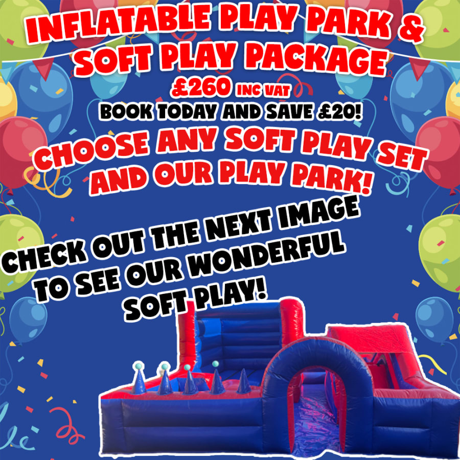This package features our all new Inflatable Play Park, an all in 1 bouncy castle, inflatable slide and ball pit enclosure to keep children entertained and safe. To add to the fun, choose from any of our wonderful Soft Play sets. Each and every set includes 17 soft play pieces, a large ball pit (that's 2 ball pits included within this package), 4 Didicars and seesaw. What's not to love?