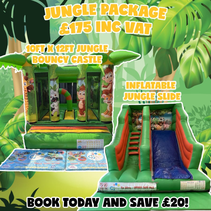 Oh no! Can you feel that? What's that noise? It's a rumble in the jungle! Let your cheeky monkeys run wild with our all new Jungle Package! This package features 2 beautifully themed jungle inflatables...because 2 bouncy castles are better than 1 right?