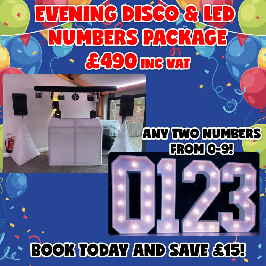 Our Evening Disco and LED Numbers Package is the perfect way to celebrate your special occasion! Book our mobile disco service for any occasion, whether it's your sweet 16th, 50th birthday or 10th wedding anniversary. Whatever your occasion, match it with our all new fantastic 4ft LED Numbers! Book anytime for a maximum of five hours from 6pm - 12am for your Evening Disco.