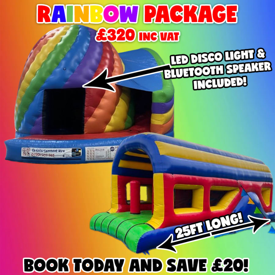 Our all new Rainbow Package features two of our most brightly coloured inflatables we have to offer! Our huge Disco Dome Twister Slide really is one of a kid. It includes a large inflatable bed for users to jump on, curved side slide, an LED disco light and bluetooth speaker included absolutely FREE!