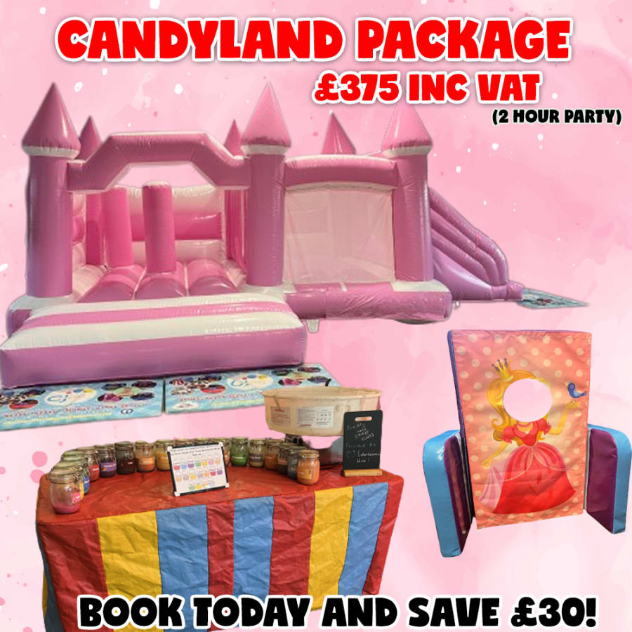 The main show stopper within this package is the absolute HUGE Candy Land Play Arena! With two inflatable jumping beds, side slide, biff bash posts and optional ball pit, it really is fit for any princess. You'll be the queen of the castle before you know it.