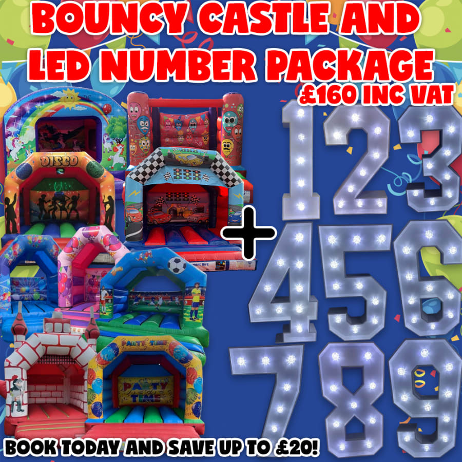 There's no better way than celebrating your child's birthday or celebration with a bouncy castle! Our Bouncy Castle & LED Number Package allows you to choose from over 15 different inflatables included within the package. Once you've made your choice, add on one of our bright 4ft LED Numbers and celebrate your occasion in style!
